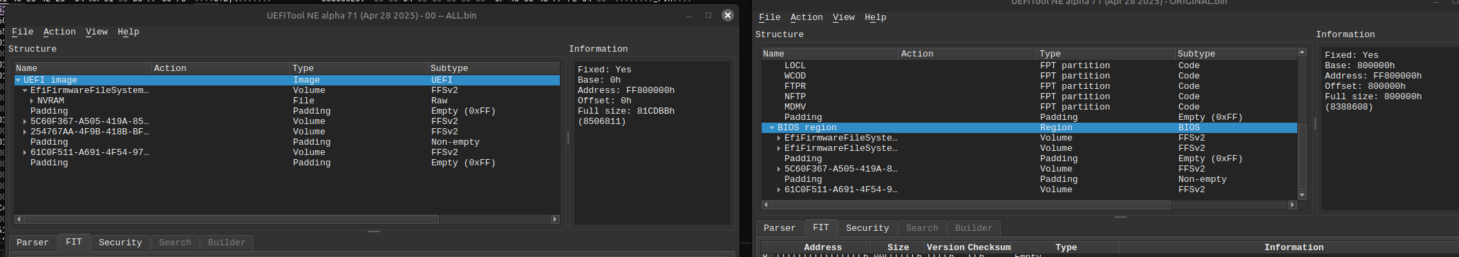 Using BIOSUtilities extract "IMAGES00.ROM" to a directory and look for the file "00 -- ALL.bin" (here is mine), use UEFITool and make sure it looks like this (left):