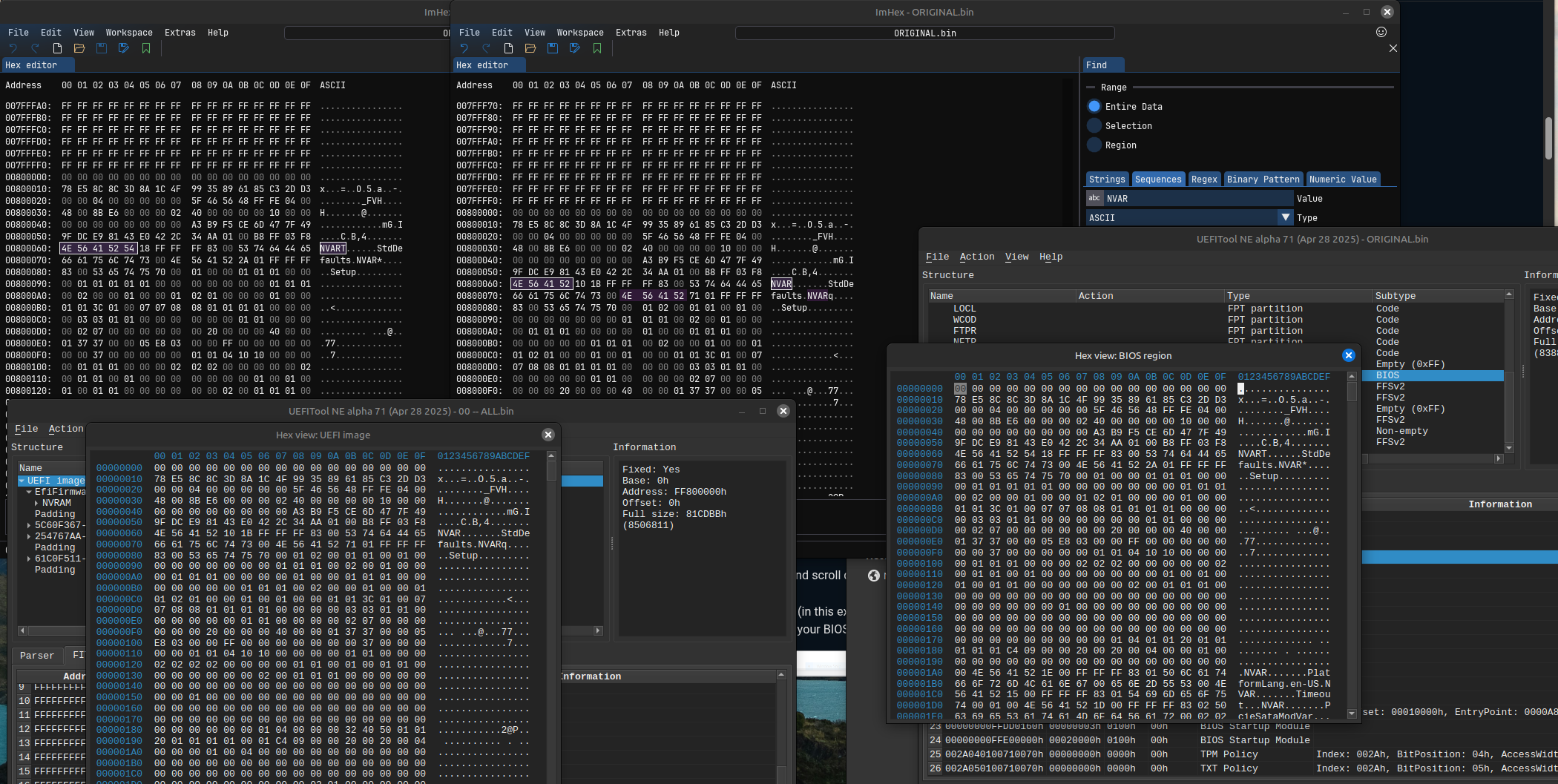 In ImHex or another hex editor, open the file "00 -- ALL.bin" and copy everything, then in your backup file made in step 1, replace the bios region (at address 800000) with the copied data. In the below image, the ImHex window on the right contains the modified original bios, notice that the hex at 800060 now reads NVAR instead of NVART: