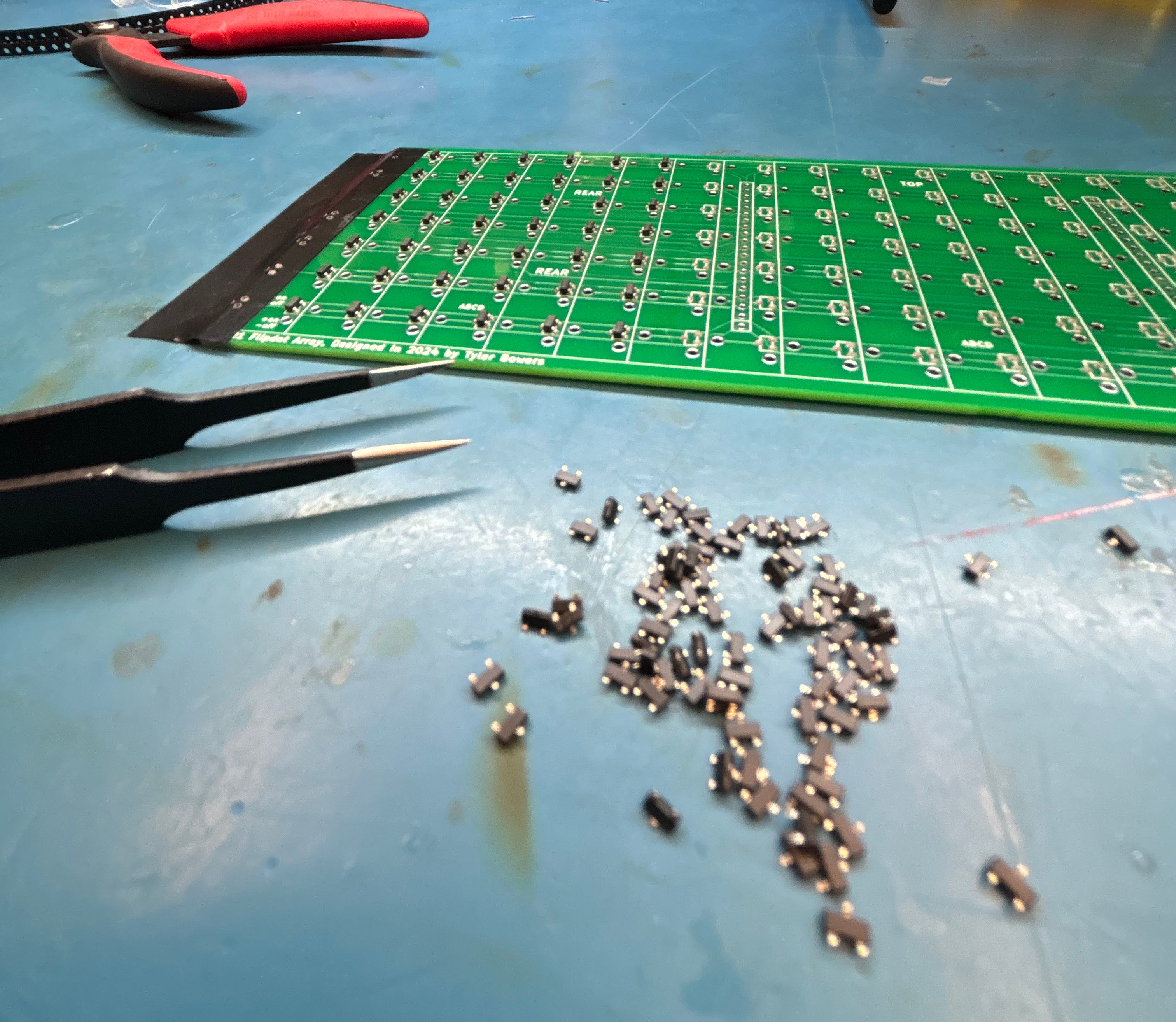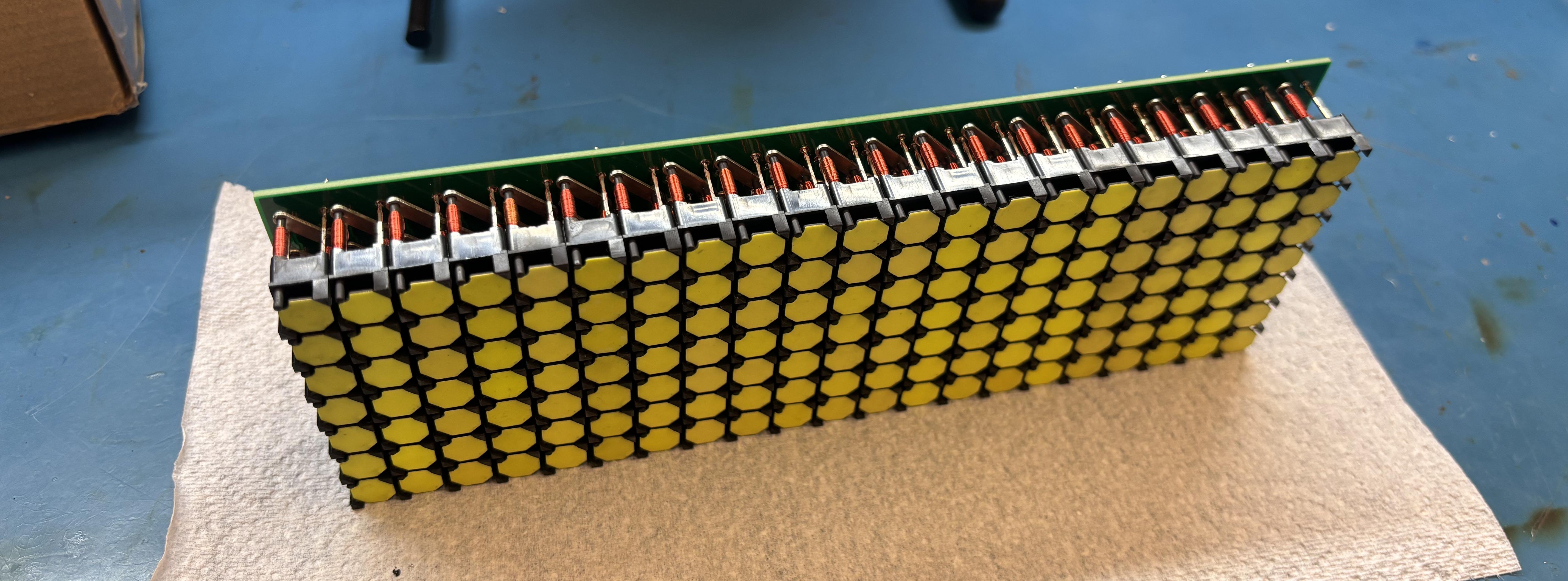 I got the flipdots NOS from eBay, specifically from Portugal. Initially I ordered enough for 1 display and some extra, but I ordered more, enough for 4 displays, for some friends. Initially I had a custom PCB made by JLCpcb for a 7x7 array:
