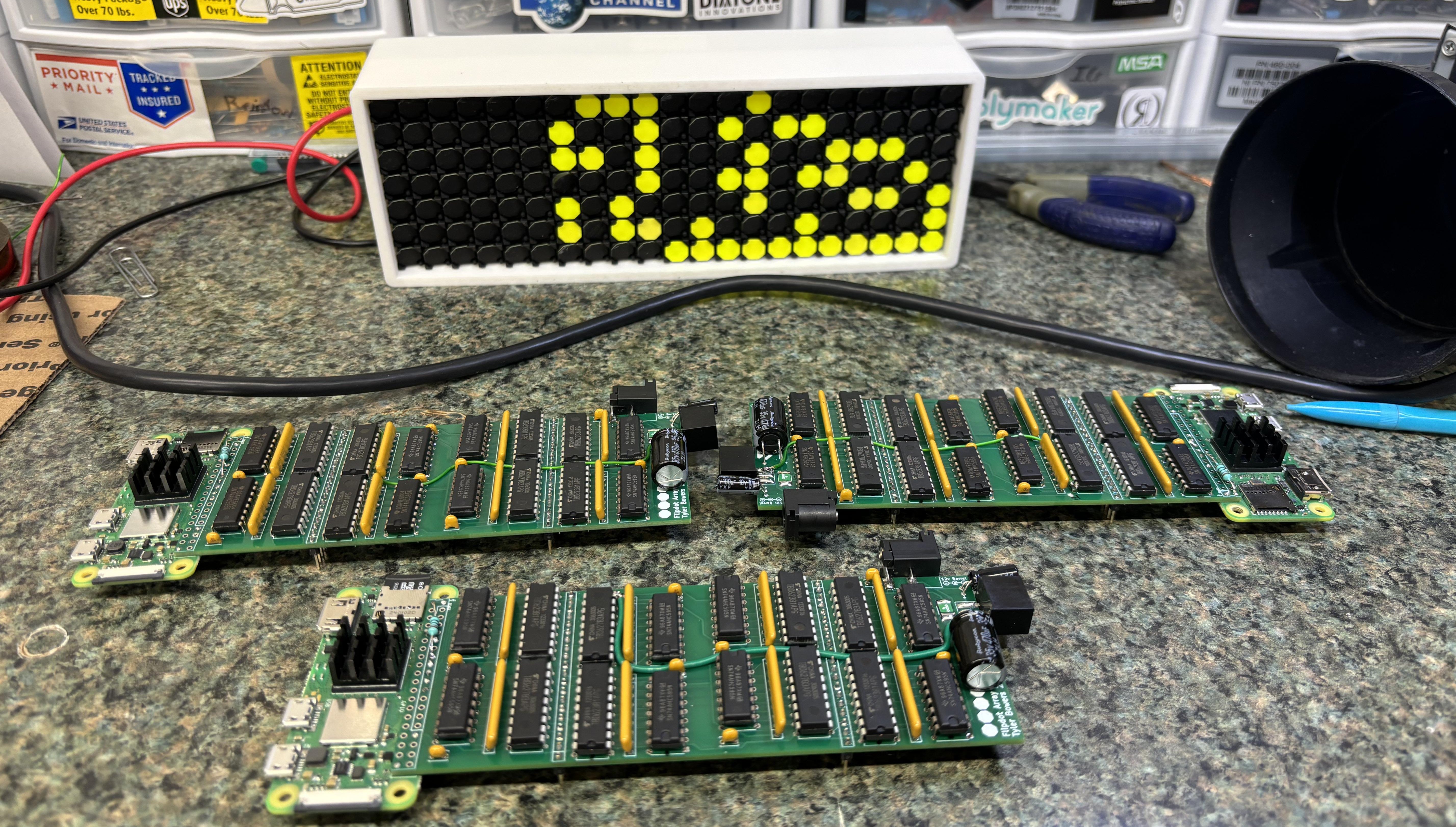 For this project all I used 21 1x7 flipdot arrays, I had to design the array PCB, controller PCB, enclosure, and software. The Github repo for this project is here.
