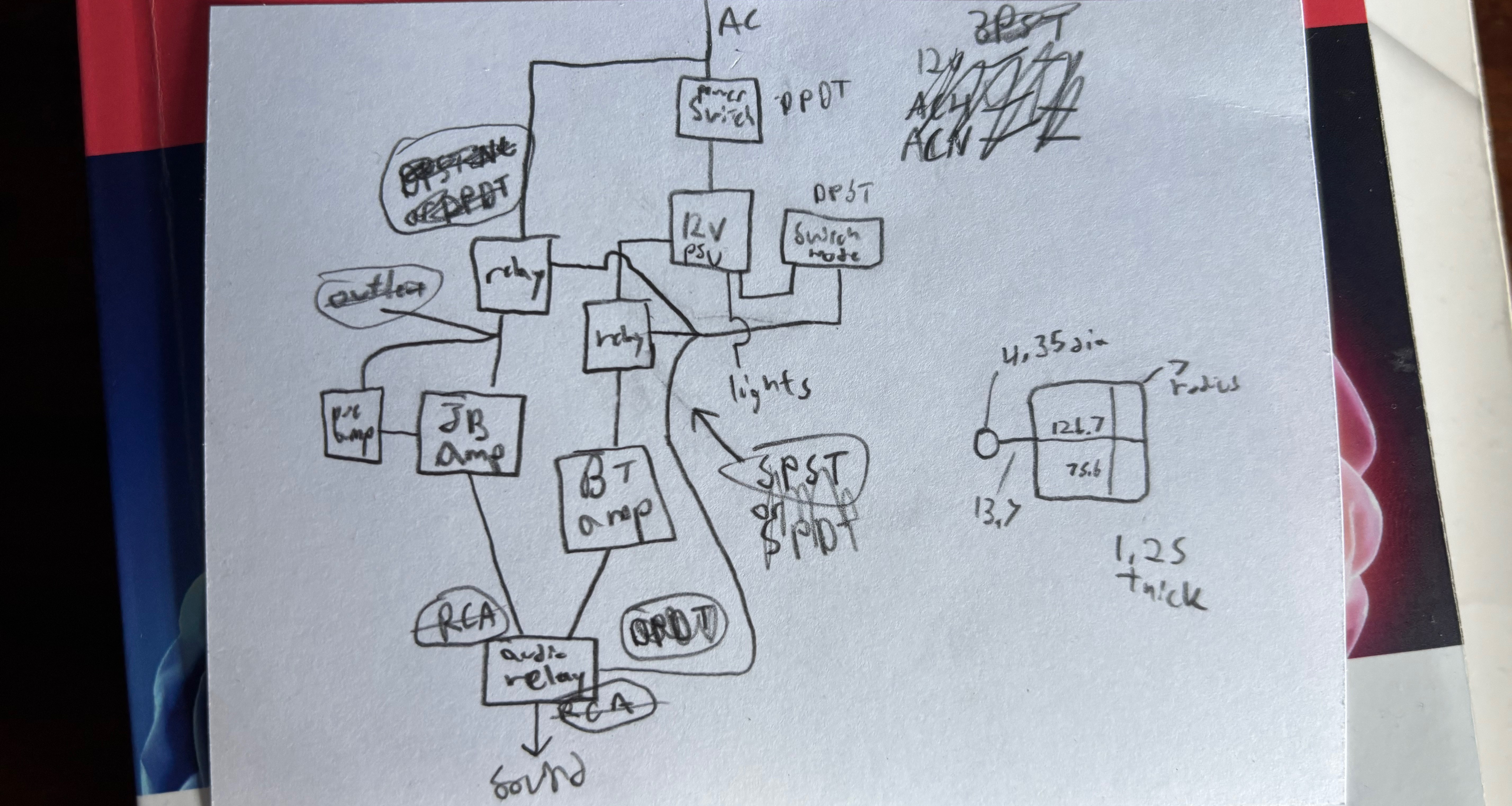 Then I decided that I wanted to add a Bluetooth module since it is very annoying to switch out records and I can then extend the life of the amp this way. I went with a Wuzhi ZK-1002Q bluetooth amplifier and a series of relays that allows me to switch between powering the jukebox or Bluetooth Amplifier. I also switch the audio output since I didn't want to risk backfeeding the jukebox amplifier. The diagram below does not contain a relay that is used for bridging grounds (needed for the bluetooth amp).